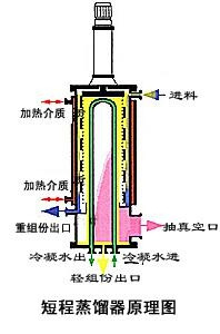 短程蒸餾器由外加熱的垂直圓筒體、位于它的中心冷凝器及在蒸餾器和冷凝器之間旋轉(zhuǎn)的刮膜器組成。